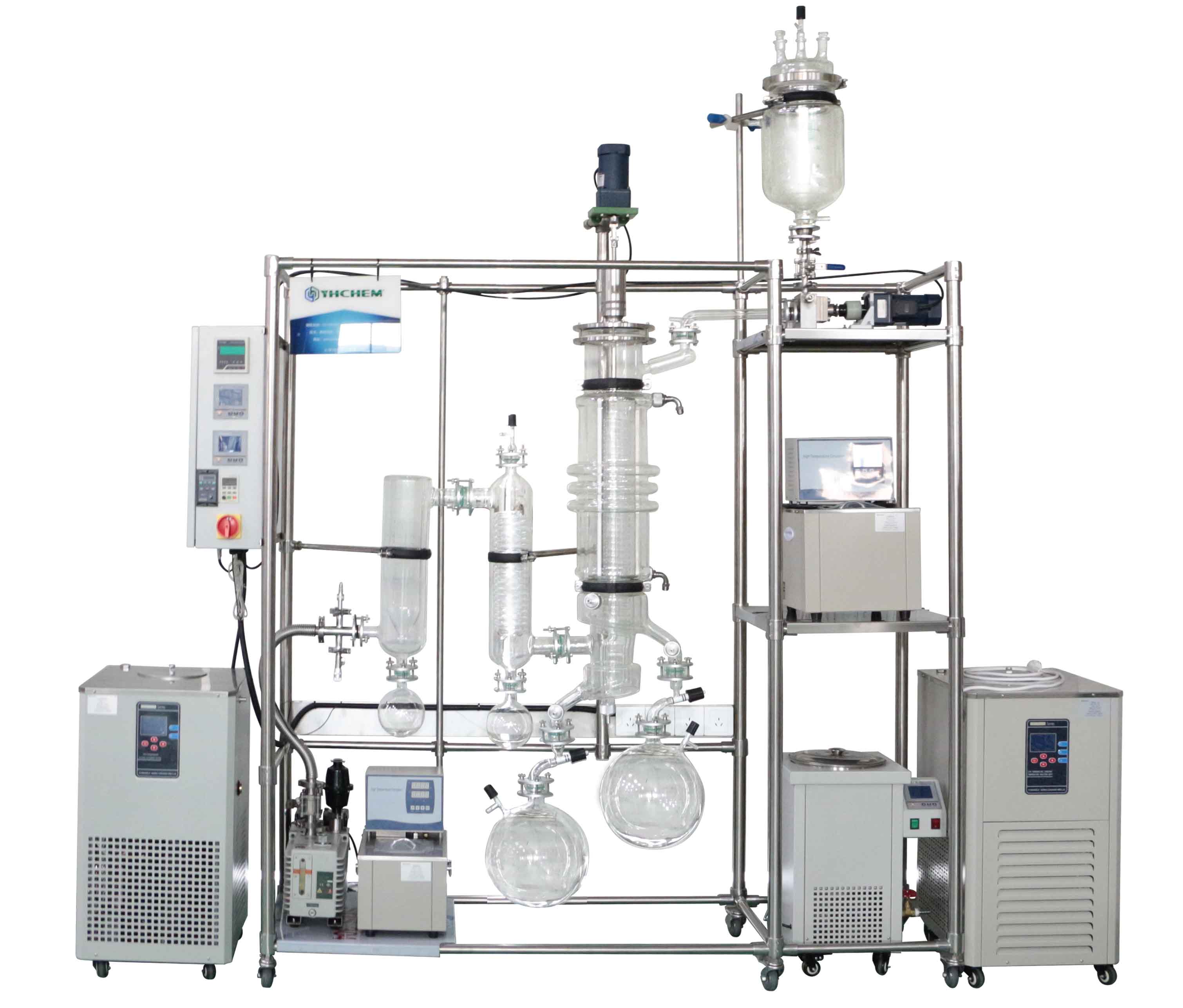 薄膜蒸馏系统通过刮板成膜技术让物料在主蒸发器内壁形成薄膜,传热传质效率极高,分离速度快,适配工业化连续生产。